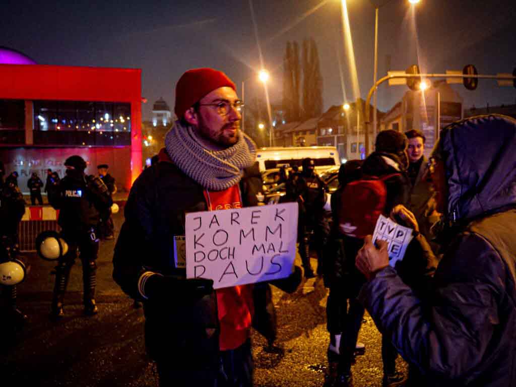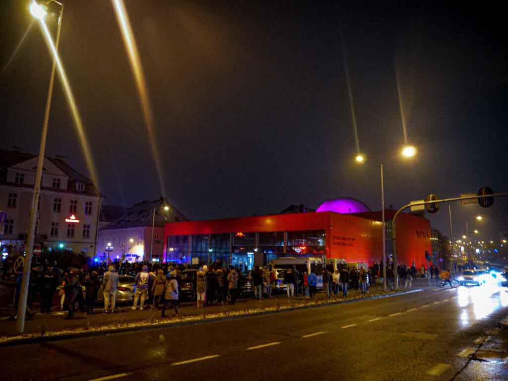 Około 17.00 Planetarium zostało już otoczone kordonem policji, a na spotkanie z prezesem PiS były wpuszczane wyłącznie wybrane osoby, sprawdzano dowody osobiste. Przed Planetarium protestowali mieszkańcy, działacze KOD, parlamentarzyści opozycji, m.in. poseł Waldemar Sługocki i posłanka Anita Kucharska-Dziedzic, przedstawiciele samorządów, m.in. członek zarządu województwa Marcin Jabłoński, radny województwa Grzegorz Potęga, radni miasta Janusz Rewers, Marcin Pabierowski i Sławomir Kotylak. Większość z transparentami. Jak donosili uczestnicy na swoich profilach, kilka osób zostało odprowadzonych do policyjnych radiowozów.