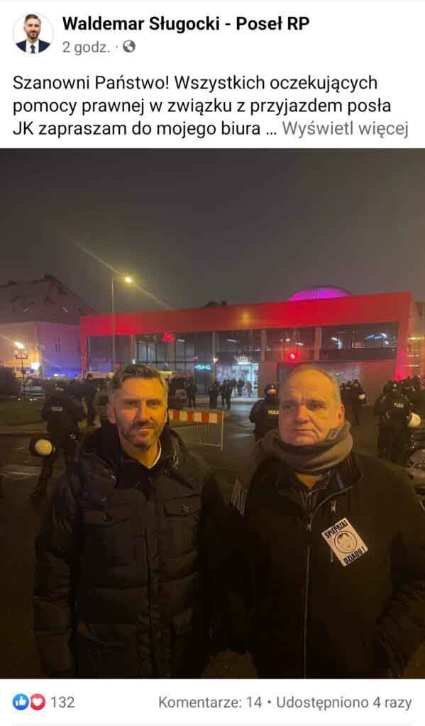“Szanowni Państwo! Wszystkich oczekujących pomocy prawnej w związku z przyjazdem posła JK zapraszam do mojego biura poselskiego od poniedziałku do piątku od 8:00 do 16:00, ul. Bohaterów Westerplatte 9/204” – napisał w trakcie demonstracji na Facebooku poseł Waldemar Sługocki.