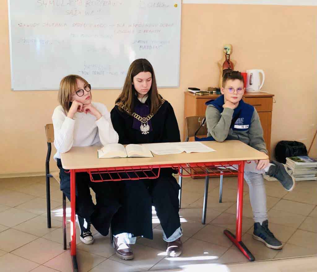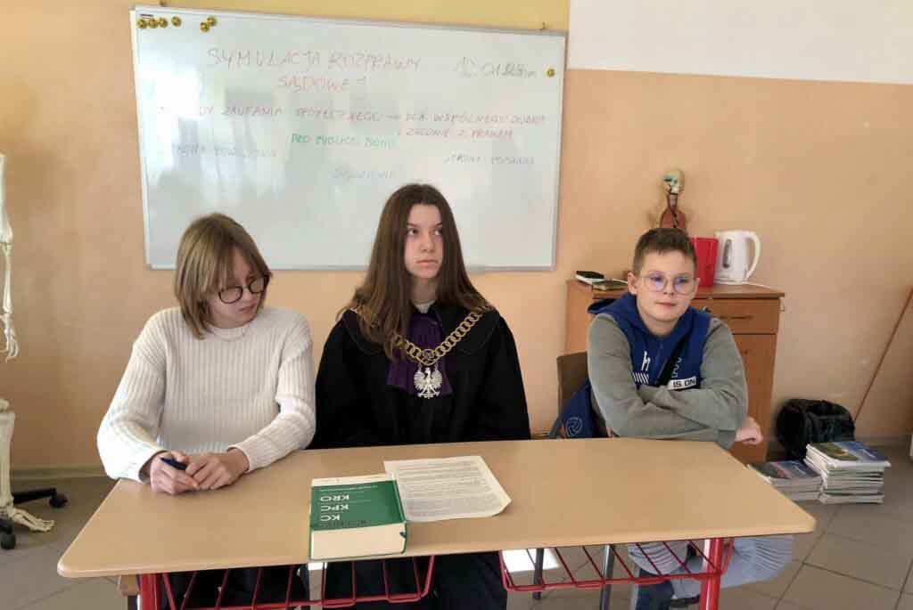Pełnomocnikiem pozwanego była pani adwokat Anna Synowiec, która nie tylko skutecznie reprezentowała pozwanego, ale opowiedziała o zawodzie adwokata, zawodach prawniczych, regułach prawa i procedur jako zabezpieczenia praw obywateli. – Uczniowie w praktyce poznali zasadę prawa do obrony, oceny dowodów, prawa do sądu i do do odwołania, kiedy trzeba mówić prawdę przed sądem, a kto może odmówić zeznań. To było świetne 90 minut zabawy i nauki – mówi mecenas Anna Synowiec