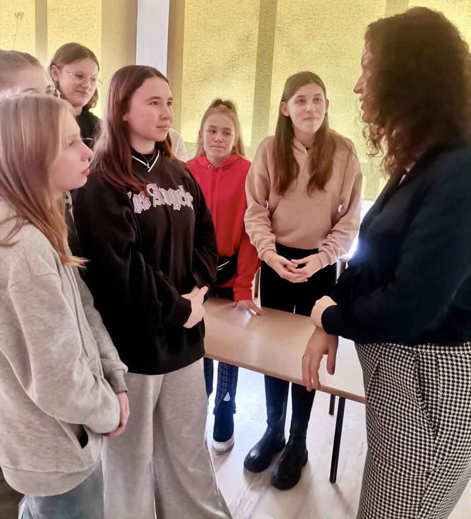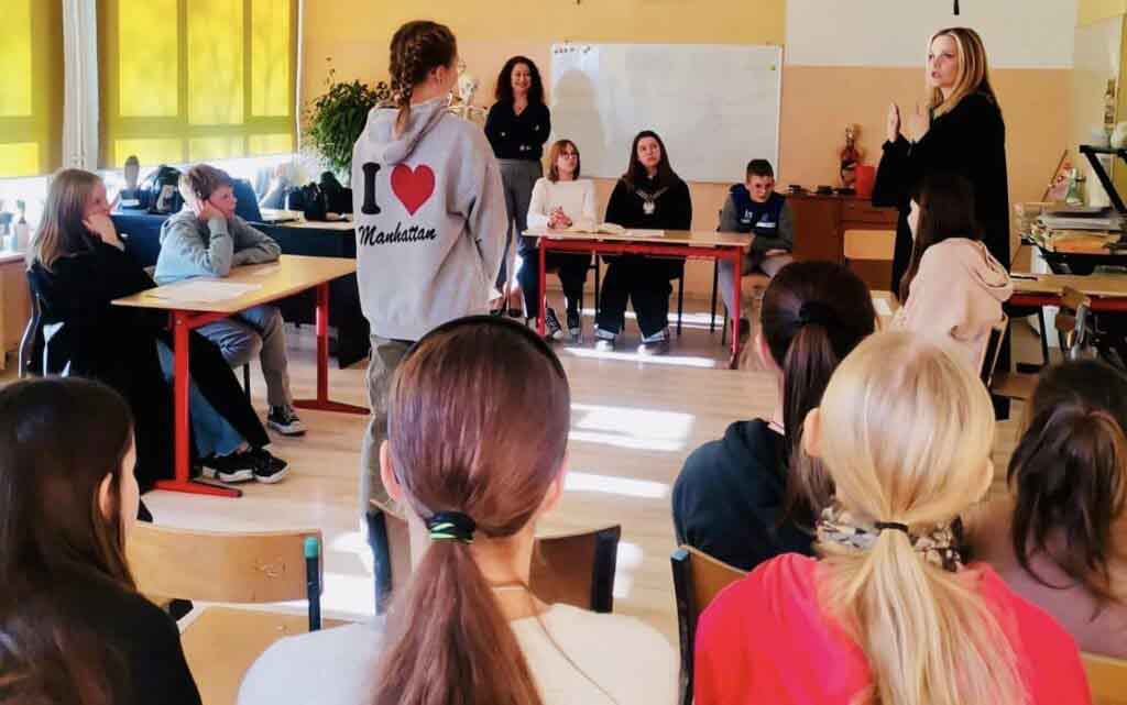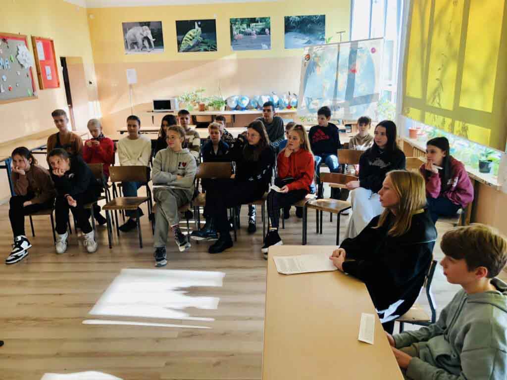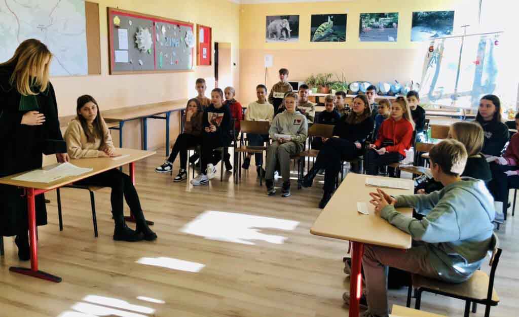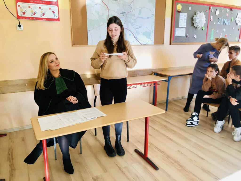 dlaczego należy mówić wyraźnie, głośno, poprawnie, jak formułować argumenty, budować pytania. Mowa końcowa pani adwokat to był świetny przykład kunsztu oratorskiego- po rozprawie uczniowie pytali o wagę poprawnego języka, ale też o studia prawnicze i ścieżkę kariery.