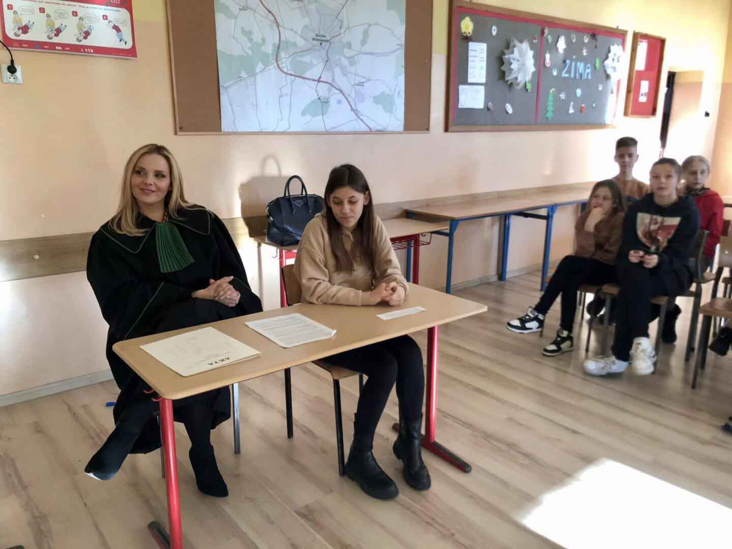 dlaczego należy mówić wyraźnie, głośno, poprawnie, jak formułować argumenty, budować pytania. Mowa końcowa pani adwokat to był świetny przykład kunsztu oratorskiego- po rozprawie uczniowie pytali o wagę poprawnego języka, ale też o studia prawnicze i ścieżkę kariery.