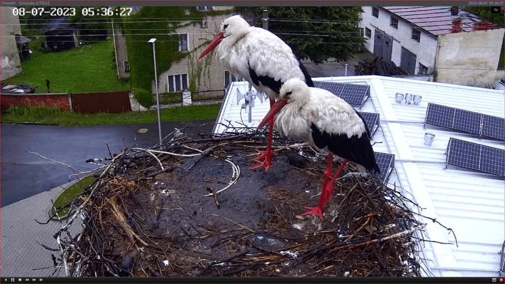 Dorosłe bociany – rodzice młodych, które rozpoczęły wędrówkę – odpoczywają na gnieździe w Żywocicach (zdjęcie z kamery nad gniazdem, oprac. J. Siekiera)