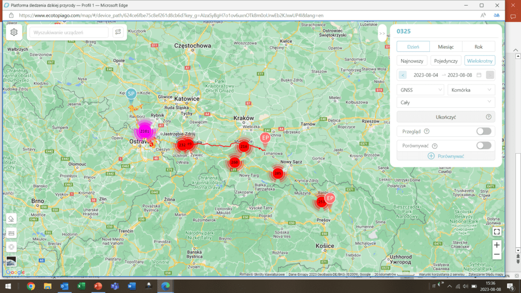 Mapka wędrówki dwóch młodych bocianów z gniazda w Żywocicach. Odlot z lęgowiska – 4 VIII 2023, następnie 5-7 VIII postój w Czechach, co najprawdopodobniej związane było z załamaniem pogody, i kontynuacja wędrówki w kierunku południowo-wschodnim (oprac. J. Siekiera).