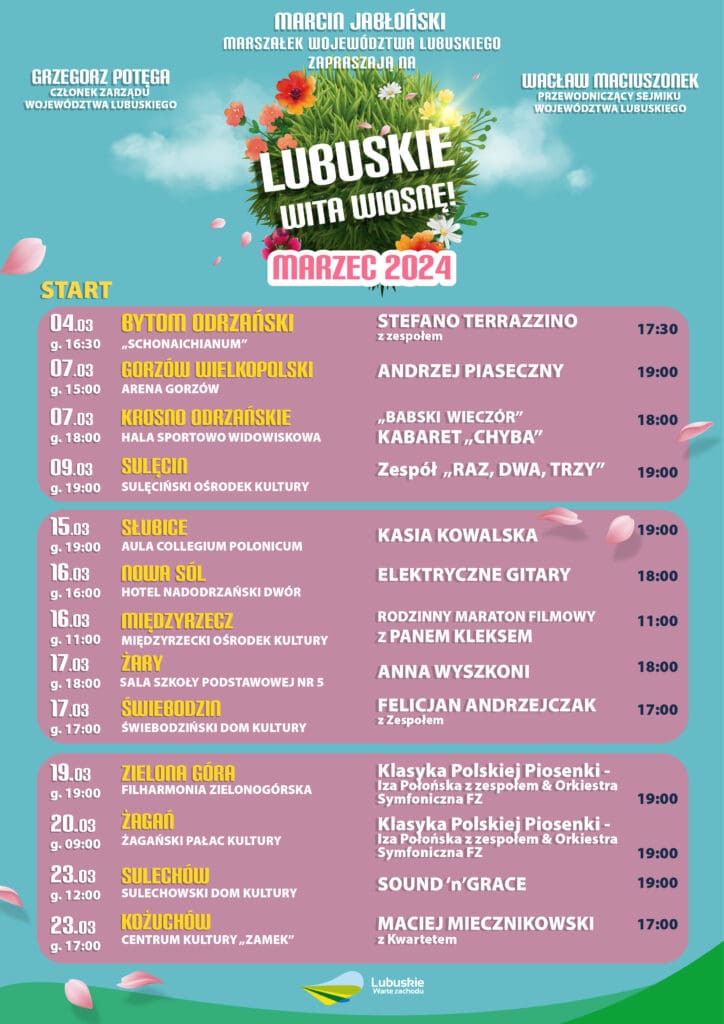„Lubuskie wita wiosnę” to cykl, za którym stoi urząd marszałkowski województwa lubuskiego. Urzędnicy przygotowali w sumie 13 koncertów w całym regionie. Za nami już 4 imprezy, co oznacza, na Lubuszan czeka jeszcze 9 okazji do zabawy. Najbliższa zaplanowano w piątek (15 marca) w Słubicach. Gwiazda wieczoru będzie Kasia Kowalska.