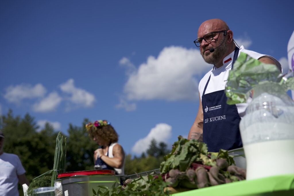 Szef Proc zademonstrował gościom imprezy, jak sporządzić chłodnik lubuski. Niby nic nadzwyczajnego, ale lokalne produkty mleczarskie, warzywa, zioła sprawiły, że chłodnik rzeczywiście był inny. Wśród swoich ulubionych “materiałów” kucharz wymienia pstrągi z Pliszki, indyki, grzyby…