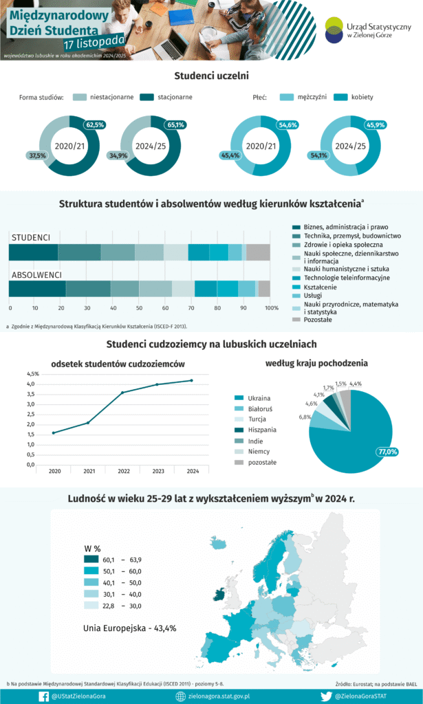 17 listopada obchodzimy Międzynarodowy Dzień Studenta – święto, które przypomina o znaczącej roli młodych ludzi w kształtowaniu przyszłości. Z tej okazji Urząd Statystyczny w Zielonej Górze przygotował zestawienie, które pokazuje, jak wyglądała studencka społeczność w województwie lubuskim w roku akademickim 2024/2025.